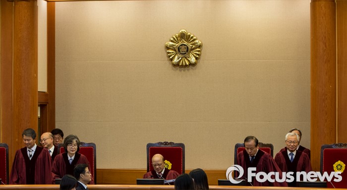 (서울=포커스뉴스) 한글을 우리 고유문자로 규정한 현행법이 헌법에 어긋나는지를 판단하는 '국어기본법 제3조' 등에 대한 공개변론이 12일 오후 서울 종로구 헌법재판소 대심판정에서 열렸다. 이날 변론에 참석한 박한철 헌법재판소장을 비롯한 헌법재판관들이 착석하고 있다.