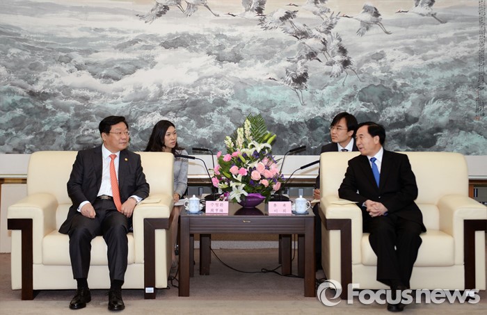 (서울=포커스뉴스) 주형환 산업통상자원부 장관이 12일(현지시간) 중국 요녕성 당위원회 사무실에서 리 시(李希, Li Xi) 중국 요녕성 당서기와 양국 대표단이 참석한 가운데 면담을 갖고, 한-요녕성 경제협력 및 발전방향과 한중 FTA시대 경제협력 강화방안, 선양 한류상품박람회 등을 주제로 의견을 교환하고 있다. <사진제공=산업통상자원부>