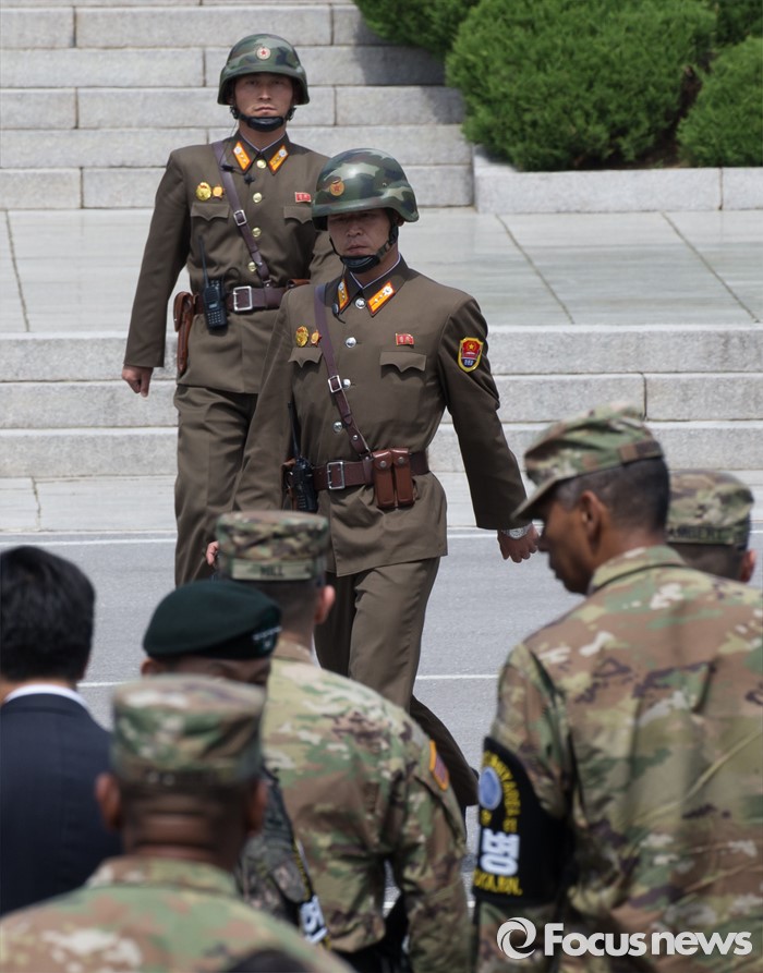 (파주=포커스뉴스) 빈센트 브룩스 신임 한·미연합사령관 겸 주한미군사령관과 이순진 합참의장이 12일 오후 경기도 파주시 판문점 공동경비구역(JSA)을 방문, 북한군 병사들이 미군과 남측 인원들을 주시하고 있다.