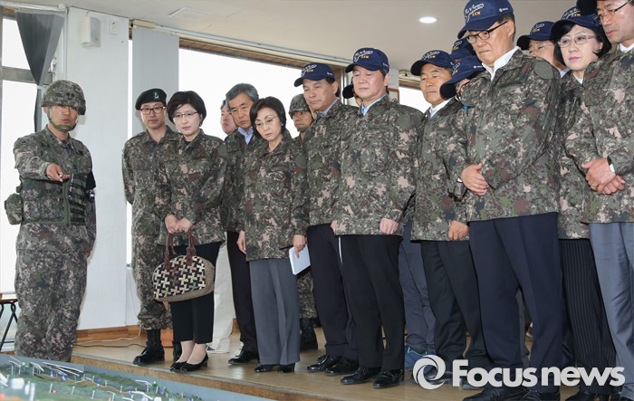 (연천=포커스뉴스) 안철수 국민의당 상임공동대표, 박지원 원내대표 등 의원 및 당선인들이 12일 오전 경기도 연천 전방부대를 방문해 경계작전 현황을 보고 있다.