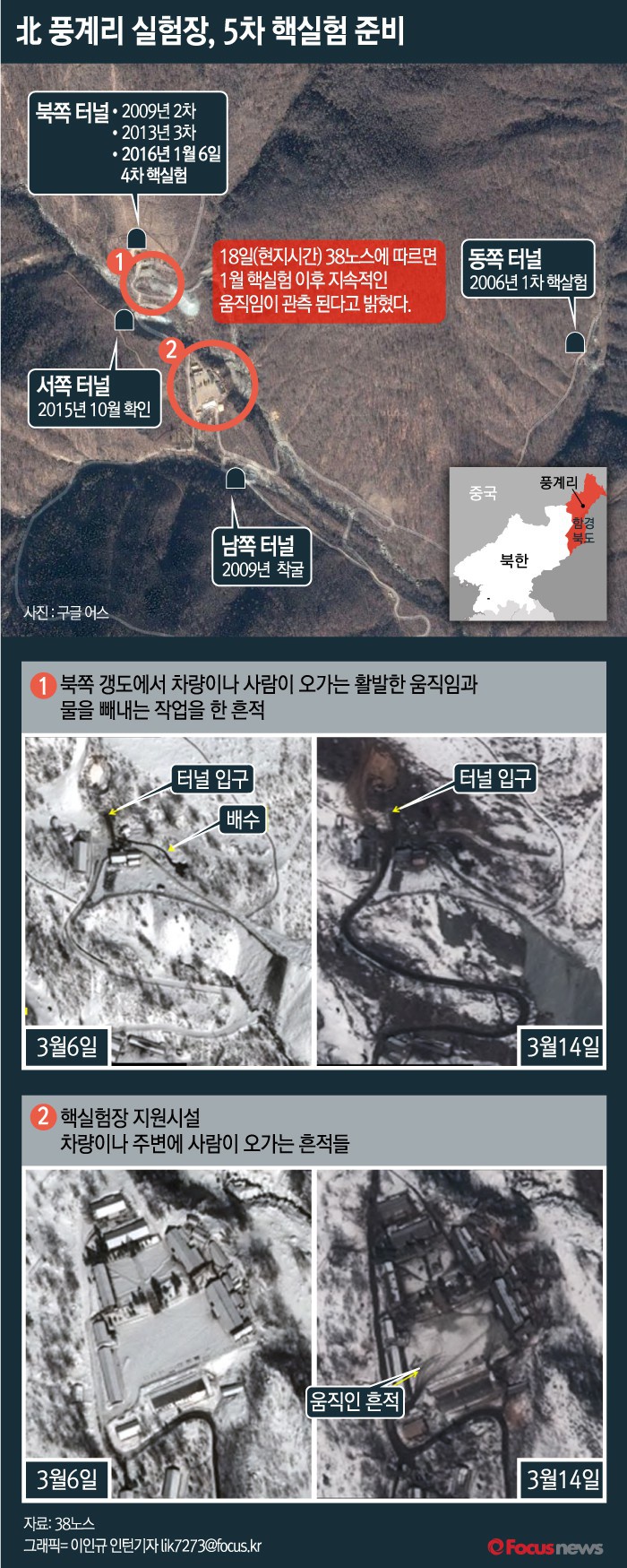 북한 함경북도 길주군 풍계리 핵실험장은 인력과 차량의 움직임이 포착되고 있는 것으로 전해지고 있다.