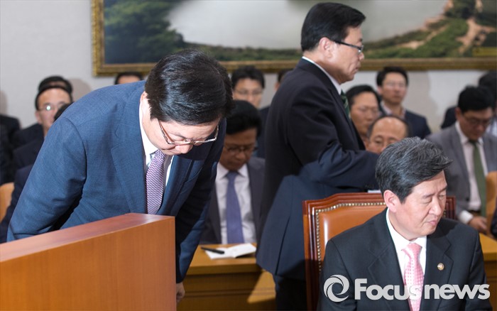 (서울=포커스뉴스) 12일 오후 서울 여의도 국회에서 열린 농림축산식품해양수산위원회 전체회의에 참석한 김영석 해양수산부 장관이 인사말에 앞서 인사하고 있다. 왼쪽부터 김 장관, 이동필 농림축산식품부 장관, 윤학배 해수부 차관.