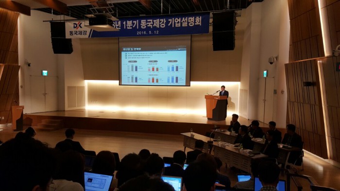 건설경기 호조에 따른 봉형강 실적에 대해서는 “부동산 선행지표들이 전혀 안 꺾이고 있다”며 “올 하반기 내년 상반기까지는 봉형강에서 매출이 꾸준할 것으로 본다”고 말했다. 이어 “고철이 급등함에 따라 2분기에는 봉형강 기준가격을 6만원 올렸다”며 “원가 인상분을 반영했기 때문에 수익성도 확보도 가능하다”고 강조했다.12일 서울 중구 페럼타워에서 열린 동국제강 1분기 기업설명회(IR) 2016.05.12 송상현 기자