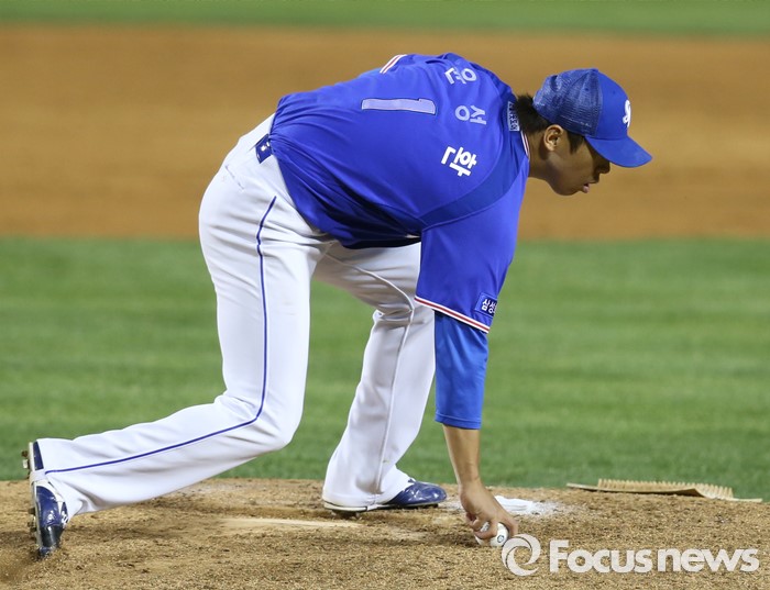 (서울=포커스뉴스) 12일 서울 잠실구장에서 열린 2016 프로야구 삼성-LG 경기 5회말 2사 2루에서 삼성 투수 윤성환이 LG 히메네스의 타구를 잡고 있다.