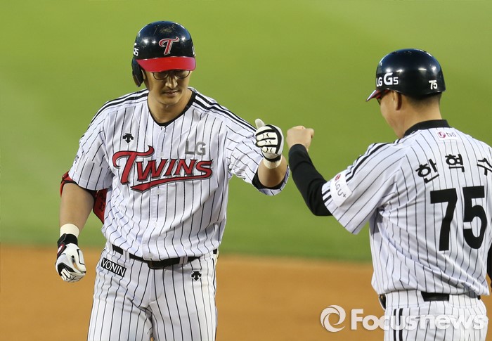 (서울=포커스뉴스) 12일 서울 잠실구장에서 열린 2016 프로야구 삼성-LG 경기 3회말 1사 3루에서 LG 박용택이 우전 적시타를 날리고 1루에서 한혁수 코치의 축하를 받고 있다.