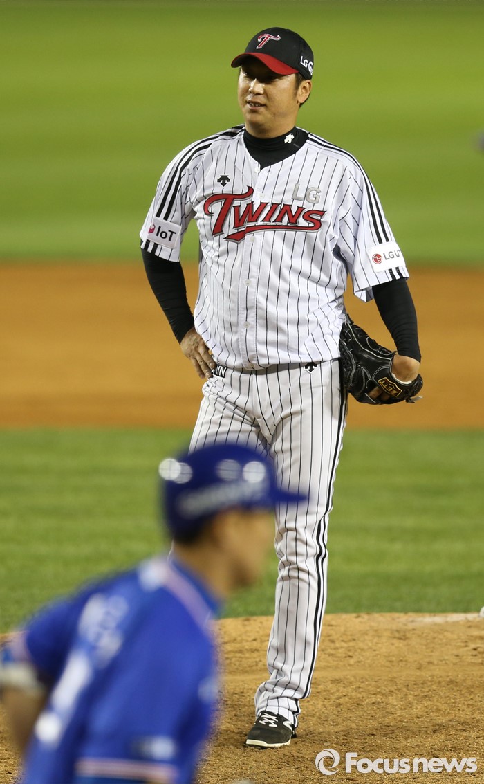 (서울=포커스뉴스) 12일 서울 잠실구장에서 열린 2016 프로야구 삼성-LG 경기 7회초 2사 만루에서 LG 투수 신승현이 삼성 배영섭을 볼넷으로 내보내고 허탈해 하고 있다.