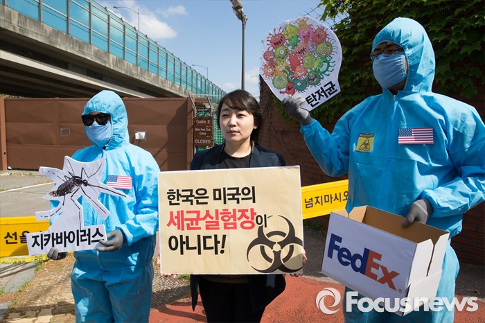 (서울=포커스뉴스) 13일 오전 서울 용산구 미8군 2번 게이트 앞에서 전쟁반대평화실현국민행동을 비롯한 시민단체 회원들이 '서울 한복판 지카바이러스 실험추진, 주한미군 규탄 기자회견'을 하고 있다.