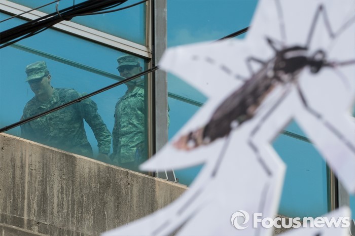 (서울=포커스뉴스) 13일 오전 서울 용산구 미8군 2번 게이트 앞에서 전쟁반대평화실현국민행동을 비롯한 시민단체 회원들이 '서울 한복판 지카바이러스 실험추진, 주한미군 규탄 기자회견'을 하고 있다.