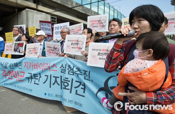 (서울=포커스뉴스) 13일 오전 서울 용산구 미8군 2번 게이트 앞에서 열린 '서울 한복판 지카바이러스 실험추진, 주한미군 규탄 기자회견'에서 용산구 주민이 규탄발언을 하고 있다.