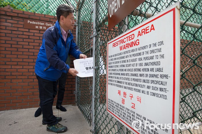 (서울=포커스뉴스) 13일 오전 서울 용산구 미8군 2번 게이트 앞에서 열린'서울 한복판 지카바이러스 실험추진, 주한미군 규탄 기자회견'을 마친 참가자가 항의서한을 전달하기 위해 입구사이 틈으로 서류를 넣고 있다.