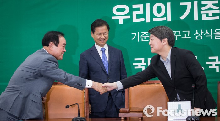 (서울=포커스뉴스) 안철수(오른쪽) 국민의당 상임공동대표와 장병완(왼쪽) 의원이 13일 오전 서울 여의도 국회에서 열린 최고위원회의에 참석해 인사하고 있다. 가운데는 천정배 상임공동 대표.