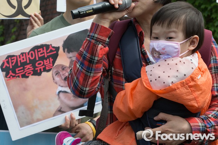 (서울=포커스뉴스) 13일 오전 서울 용산구 미8군 2번 게이트 앞에서 열린 '서울 한복판 지카바이러스 실험추진, 주한미군 규탄 기자회견'에서 용산구 주민이 규탄발언을 하고 있다.