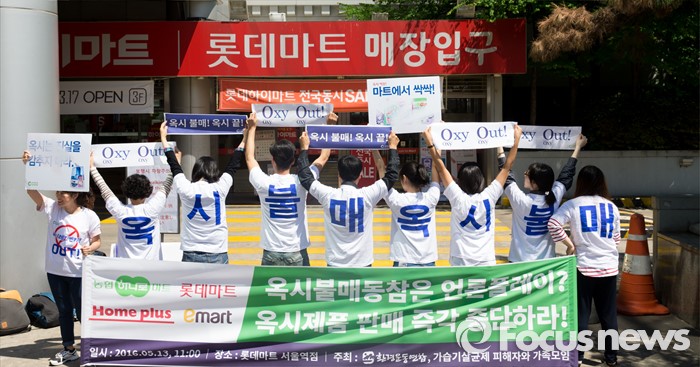 (서울=포커스뉴스) 13일 오전 서울 중구 롯데마트 서울역점 앞에서 환경운동연합과 가습기 살균제 피해자 가족모임이 '옥시 제품 즉각 판매 중단'을 촉구하고 있다.
