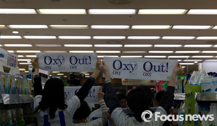 (서울=포커스뉴스) 13일 오전 서울 중구 롯데마트 서울역점에서 환경운동연합과 가습기 살균제 피해자 가족모임이 '옥시 제품 즉각 판매 중단'을 촉구하고 있다.