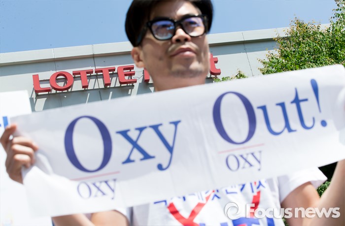 (서울=포커스뉴스) 13일 오전 서울 중구 롯데마트 서울역점 앞에서 환경운동연합과 가습기 살균제 피해자 가족모임이 '옥시 제품 즉각 판매 중단'을 촉구하고 있다.