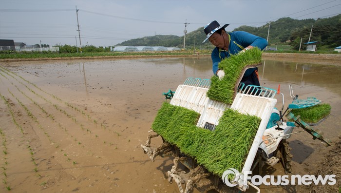 (청주=포커스뉴스) 13일 오후 충북 청주시 서원구의 한 논에서 농민이 이양기를 이용해 모내기를 하고 있다.