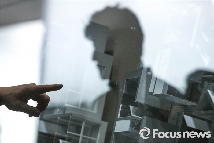 | △ 벽면에 전시된 모형 살피는 시민 |