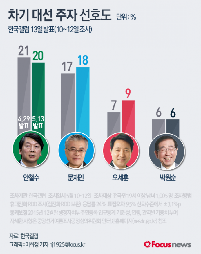 (서울=포커스뉴스) 한국 갤럽이 13일에 발표한 여론조사 결과에 따르면 차기 대선 주자 선호도는 안철수 20%, 문재인 18%, 오세훈 9%, 박원순 6% 순으로 나타났다.