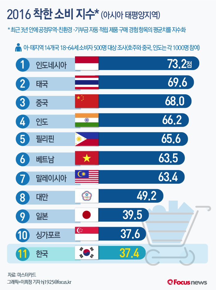 (서울=포커스뉴스)마스터카드는 공정무역 제품 구매 경험을 조사한 '착한 소비 지수'에서 한국이 아시아·태평양 14개국 중 11위를 기록했다고 13일 밝혔다. 한국은 100점 만점에 37.4점을 기록해 가장 높은 점수를 받은 인도네시아(73.2점)의 반토막 수준에 그쳤다.