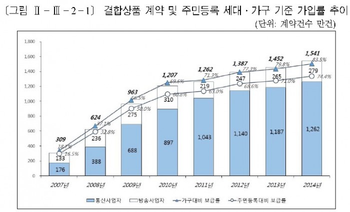 업계의 한 관계자는 “결합상품이 ‘집토끼 지키기’에 큰 효과가 있는데 해지를 쉽게 하는 개선안 마련에 소극적인 것은 당연한 일”이라며 “개선안 마련이 쉽지 않을 것”이라고 말했다.결합상품 가입율 추이.<그래프제공=미래부>