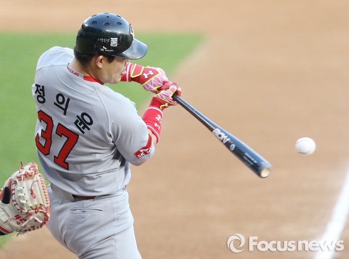 (서울=포커스뉴스) 13일 서울 잠실구장에서 열린 2016 프로야구 SK-LG 경기 1회초 2사 2루에서 SK 정의윤이 선취 득점을 올리는 중전 안타를 치고 있다.
