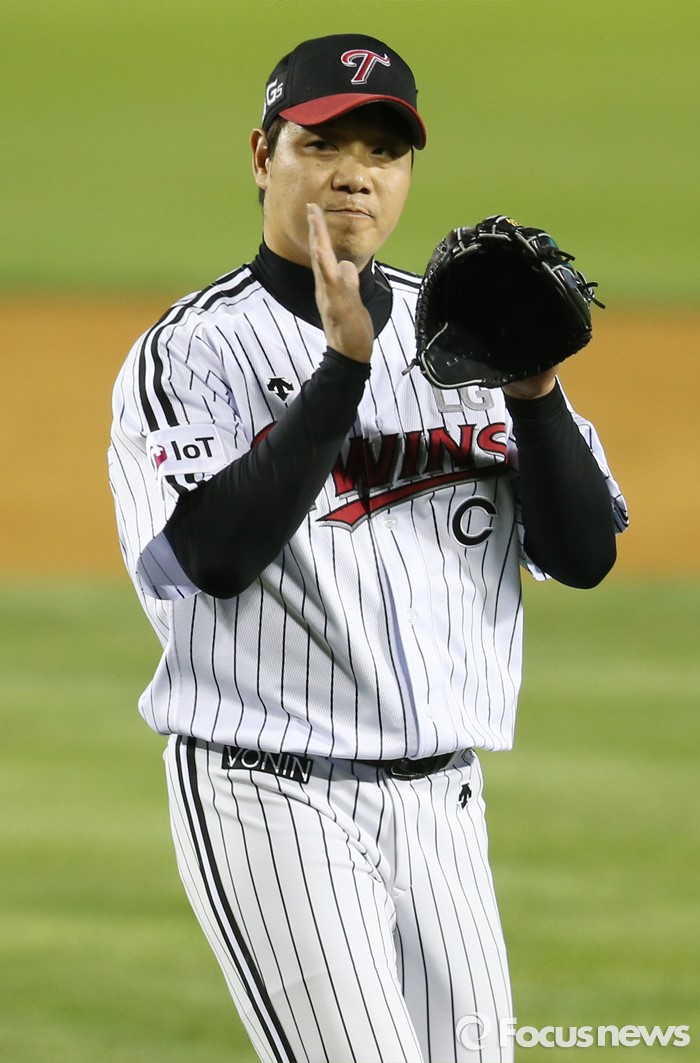 (서울=포커스뉴스) 13일 서울 잠실구장에서 열린 2016 프로야구 SK-LG 경기에서 LG 선발투수 류제국이 5회 2사 만루의 위기를 넘기고 덕아웃으로 들어가며 포수 정상호를 향해 박수를 치고 있다.