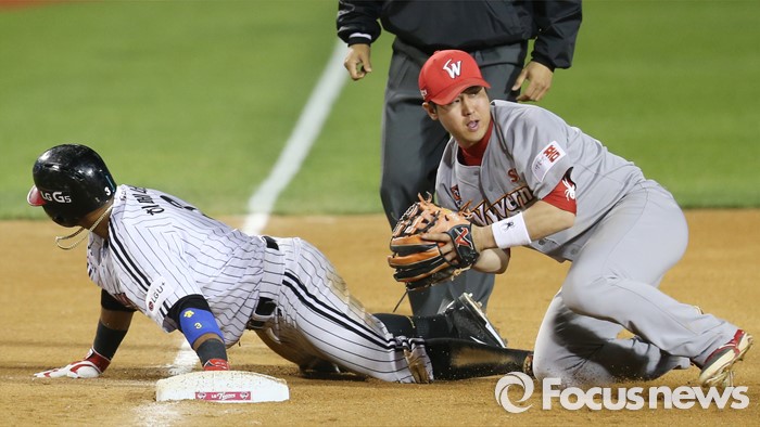 (서울=포커스뉴스) 13일 서울 잠실구장에서 열린 2016 프로야구 SK-LG 경기 6회말 무사 1,2루에서 SK 3루수 최정이 3루 도루를 시도한 LG 2루주자 히메네스를 아웃시킨후 2루를 살피고 있다.