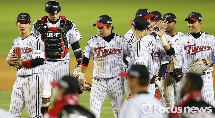 (서울=포커스뉴스) 13일 서울 잠실구장에서 열린 2016 프로야구 SK-LG 경기에서 SK를 2-1로 물리친 LG 선수들이 마운드에 모여 하이파이브하고 있다.