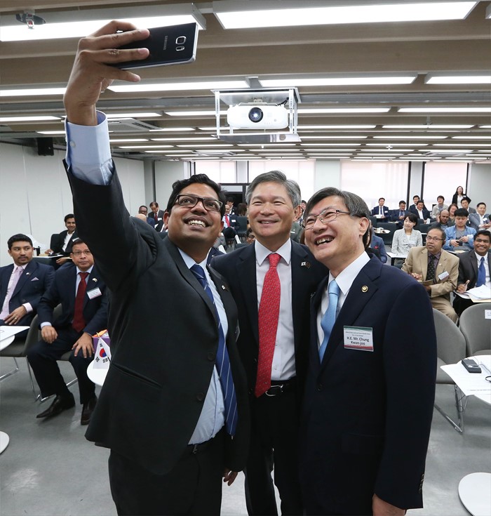 (서울=포커스뉴스) 문화체육관광부는 한국콘텐츠진흥원과 함께 13일 서울 청계천로 문화창조벤처단지 비즈센터에서 한국-방글라데시 게임 및 정보통신기술(ICT) 콘텐츠 기업 교류회를 개최했다. 정관주 문체부 제1차관(오른쪽), 주나이드 아흐메드 펄럭(H.E. Mr. Zunaid Ahmed Palak) 방글라데시 정보통신기술부 국무장관(왼쪽), 안성두 주방글라데시한국대사가‘김치’라고 외치며 기념촬영을 하고 있다. <사진제공 문화체육관광부>