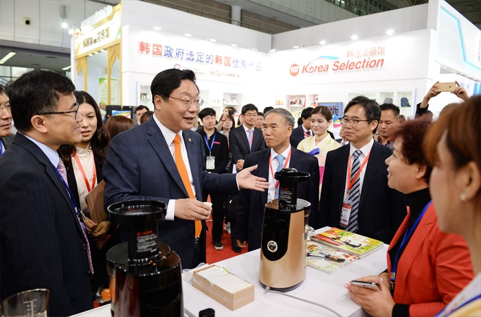 (서울=포커스뉴스) 주형환 산업통상자원부 장관이13일 중국 시안 취장국제전시센터 A홀에서 시안 실크로드박람회 주빈국 참여로 농식품, 생활용품, 의류, 화장품, 의약품 등 5대 소비재 품목의 소비재기업관, SM 융합상품관, 한국식품관(aT), K-HIT관, VR체험관(삼성전자), FTA홍보관 등 기업부스 50개사, 단체부스 50개사가 참여한 가운데 열린 ‘실크로드박람회’「국가홍보관(한국관)」개막식에 참석하여, 한국제품 전시장을 둘러보고 있다. <사진제공=산업통상자원부>