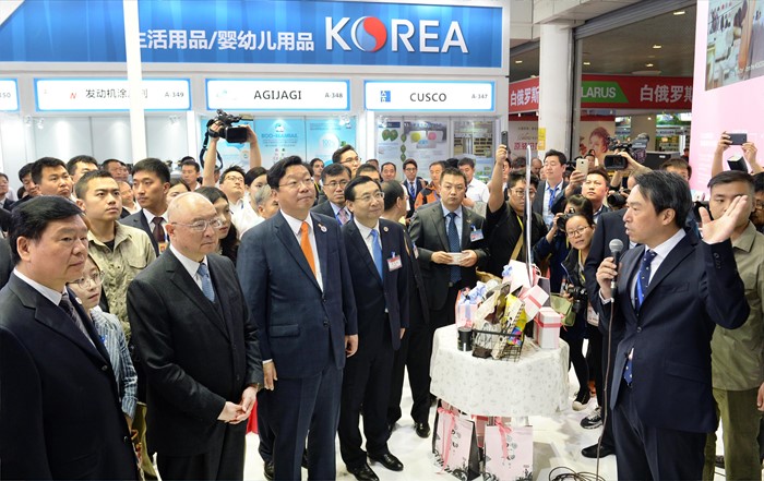 (서울=포커스뉴스) 주형환 산업통상자원부 장관이13일 중국 시안 취장국제전시센터 A홀에서 시안 실크로드박람회 주빈국 참여로 농식품, 생활용품, 의류, 화장품, 의약품 등 5대 소비재 품목의 소비재기업관, SM 융합상품관, 한국식품관(aT), K-HIT관, VR체험관(삼성전자), FTA홍보관 등 기업부스 50개사, 단체부스 50개사가 참여한 가운데 열린 ‘실크로드박람회’「국가홍보관(한국관)」개막식에 참석하여, 한국제품 전시장을 둘러보고 있다. <사진제공=산업통상자원부>