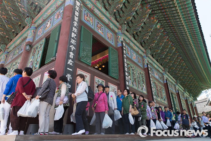 (서울=포커스뉴스) 14일 오전 서울 종로구 조계사 대웅전에서 열린 불기 2560년 부처님 오신날 봉축 법요식에서 불교신자들이 참배하기 위해 줄을 서 있다.
