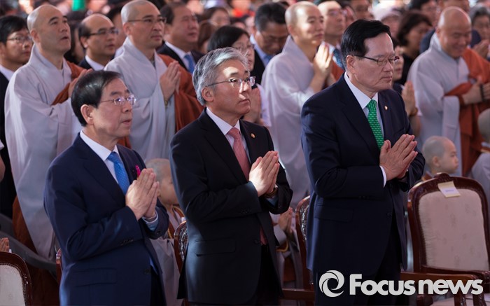 (서울=포커스뉴스) 14일 오전 서울 종로구 조계사 대웅전에서 열린 불기 2560년 부처님 오신날 봉축 법요식에서 내빈들이 합장하고 있다. 정의화(오른쪽부터) 국회의장, 김종덕 문화체육관광부 장관, 박원순 서울시장.