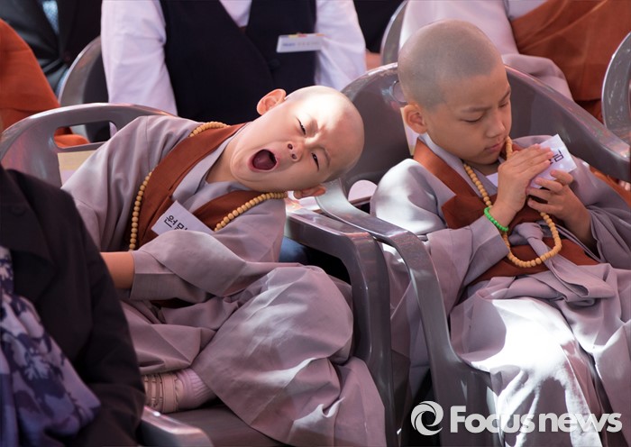 (서울=포커스뉴스) 14일 오전 서울 종로구 조계사 대웅전에서 열린 불기 2560년 부처님 오신날 봉축 법요식에서 동자승이 하품을 하고 있다.