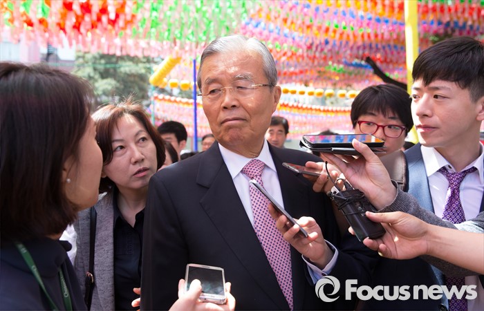 (서울=포커스뉴스) 14일 오전 서울 종로구 조계사 대웅전에서 열린 불기 2560년 부처님 오신날 봉축 법요식에서 김종인 더불어민주당 비대위 대표가 취재진 질문을 듣고 있다.