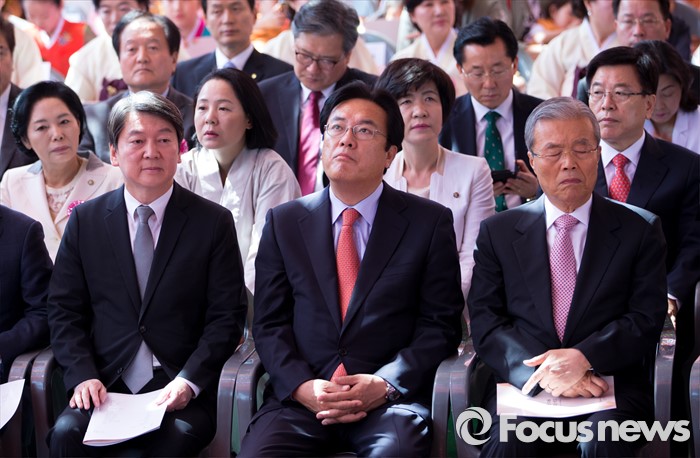 (서울=포커스뉴스) 14일 오전 서울 종로구 조계사 대웅전에서 열린 불기 2560년 부처님 오신날 봉축 법요식에서 김종인(오른쪽부터) 더불어민주당 비대위 대표, 정진석 새누리당 대표, 안철수 국민의당 상임공동대표가 참석해 있다.