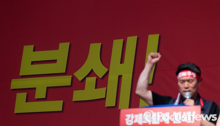 (서울=포커스뉴스) 14일 오후 서울 강서구 KBS스포츠월드에서 성과연봉제 저지를 위한 금융공기업지부 합동 대의원대회에 참석한 한 금융노조 조합원이 구호를 외치고 있다.