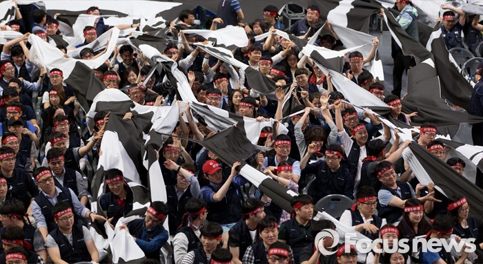 (서울=포커스뉴스) 14일 오후 서울 강서구 KBS스포츠월드에서 성과연봉제 저지를 위한 금융공기업지부 합동 대의원대회에 참석한 금융노조 조합원들이 총파업을 결의하는 상징의식으로 천을 찢고 있다.