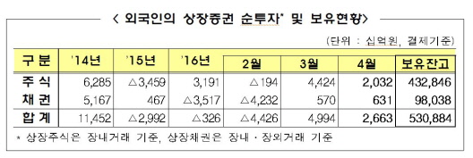 금융감독원은 지난 4월 외국인 투자자가 주식과 채권을 각각 2조원, 6310억원 매수하면서 2조6310억원이 한국 증권시장에 순유입됐다고 16일 밝혔다.
