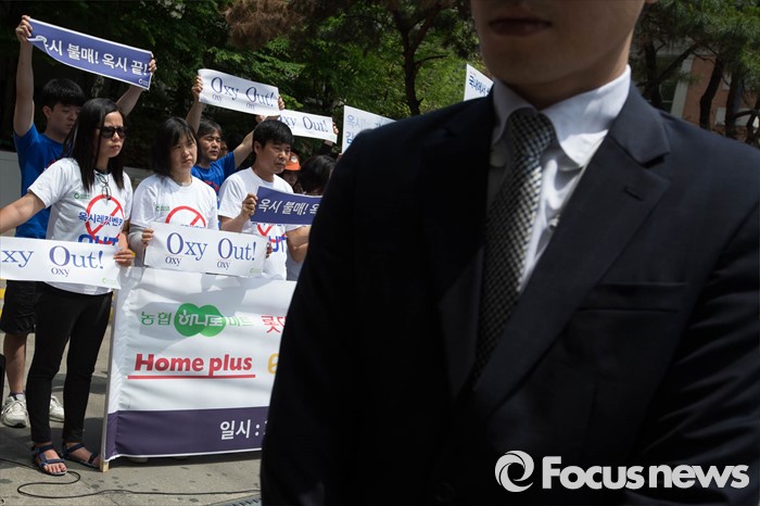 (서울=포커스뉴스) 15일 오전 서울 용산구의 한 대형마트 앞에서 환경운동연합원들이 옥시 불매를 촉구하며 기자회견을 하고 있다.