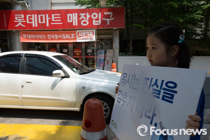 (서울=포커스뉴스) 15일 오전 서울 용산구의 한 대형마트 앞에서 환경운동연합원들이 옥시 불매를 촉구하며 기자회견을 하고 있다.