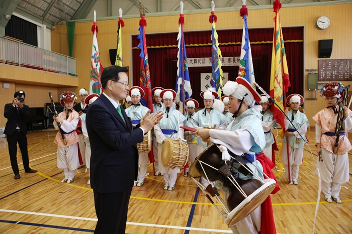(서울=포커스뉴스) 일본을 방문 중인 정의화(왼쪽) 국회의장이 15일 오전 오사카 소재 민족학교인 건국학교를 방문해 전통예술부 단원들을 격려하고 있다. <사진제공=국회>