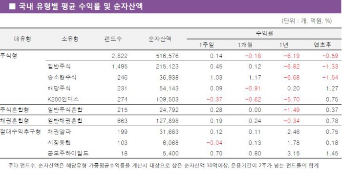 대형주 약세로 K200인덱스펀드는 -0.37%의 수익률을 기록했다. 주식혼합형과 채권혼합형펀드는 소폭 상승했고, 절대수익추구형 중 공모주하일드펀드는 0.70%의 수익률을 나타냈다.