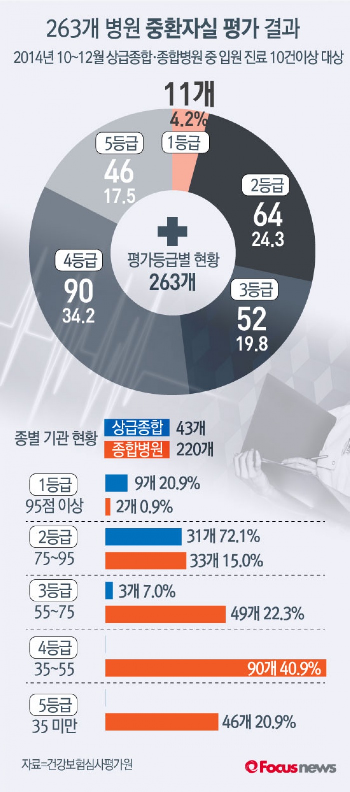 (서울=포커스뉴스) 건강보험심사평가원이 15일 공개한 263개 의료기관 대상 ‘중환자실 적정성평가' 에서 1등급을 병원은 11곳에 불과한 것으로 나타났다.