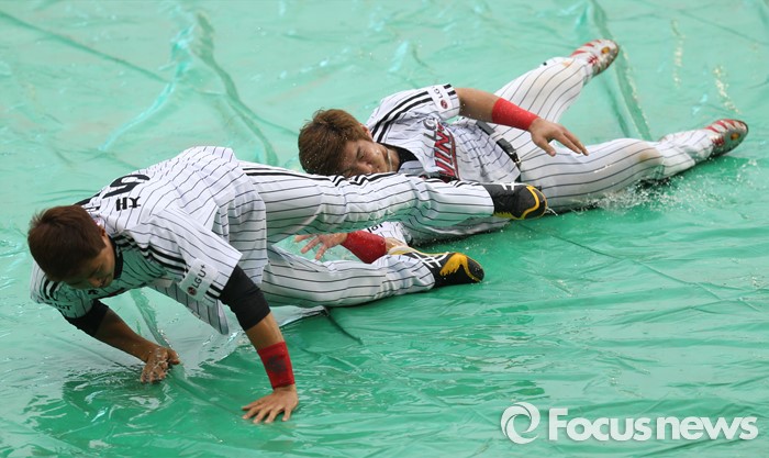 (서울=포커스뉴스) 15일 서울 잠실구장에서 열린 2016 프로야구 SK-LG 경기가 2회말을 마치고 우천으로 경기가 취소되자 LG 채은성(왼쪽)과 오지환이 팬 서비스로 비가 괴인 비가림막 위에서 슬라이딩을 하고 있다.