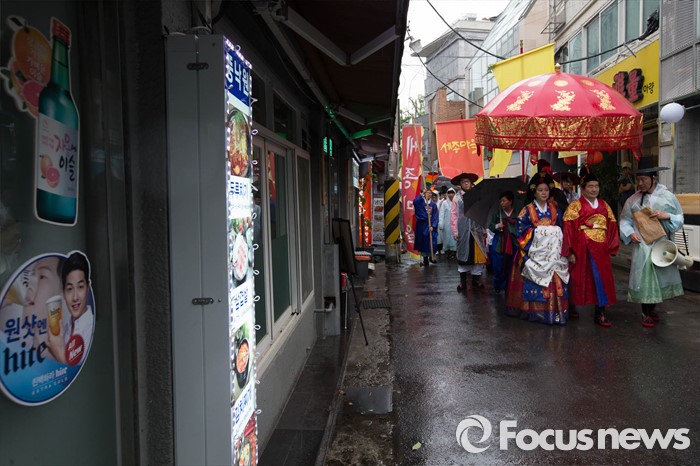 (서울=포커스뉴스) 세종대왕 탄신 619주년인 15일 오후 서울 종로구 통인시장 일대에서 세종대왕 어가행렬이 재현되고 있다.