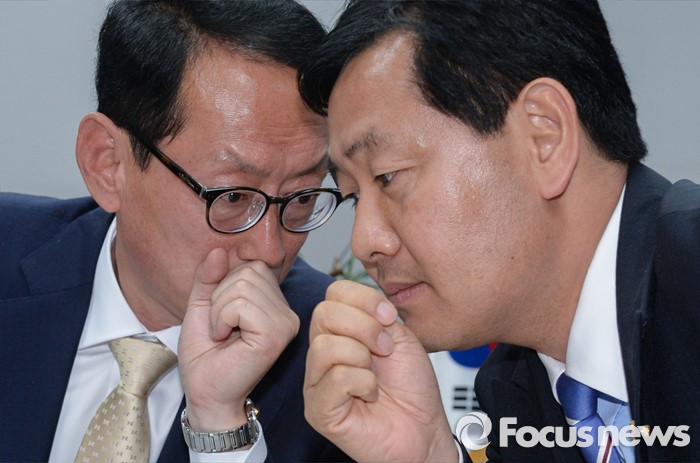 (서울=포커스뉴스) 김도읍(왼쪽) 새누리당 원내수석부대표, 김관영(오른쪽) 국민의당 원내수석부대표가 15일 오후 서울 여의도 국회 의원회관에서 19대 국회 마지막 본회의 안건 및 20대 국회 원구성 협상 등을 논의를 위한 회동에 앞서 박완주 더불어민주당 원내수석부대표를 기다리며 대화하고 있다.