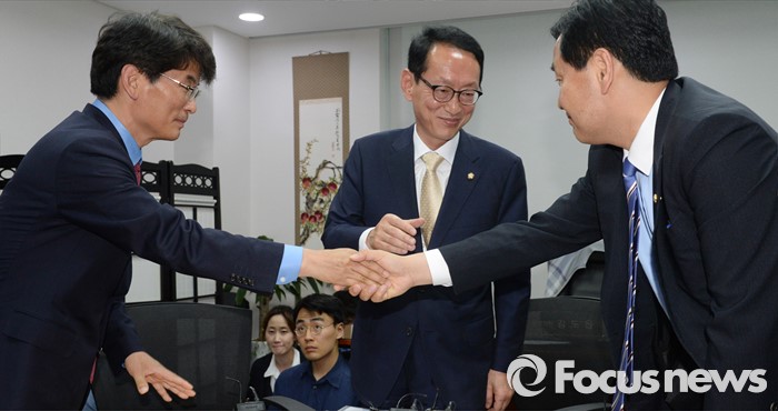 (서울=포커스뉴스) 김도읍(가운데) 새누리당 원내수석부대표, 박완주(왼쪽) 더불어민주당 원내수석부대표, 김관영 국민의당 원내수석부대표가 15일 오후 서울 여의도 국회 의원회관에서 19대 국회 마지막 본회의 안건 및 20대 국회 원구성 협상 등을 논의하기에 앞서 인사하고 있다.