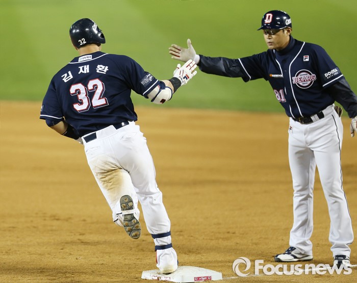 kt와 NC는 연장 12회 접전 끝에 2-2로 승부를 가리지 못했다. 양팀 투수진이 22탈삼진을 주고받으며 잘 던졌다. LG와 SK의 경기는 2-2이던 2회 종료 뒤 쏟아진 비로 인해 우천 노게임이 선언됐다.(서울=포커스뉴스) 4일 서울 잠실구장에서 열린 2016 프로야구 두산-LG 경기 9회초 2사후 두산 김재환이 우월 솔로 홈런을 치고 1루에서 한혁수 코치와 하이파이브하고 있다. 2016.05.04 우정식 기자