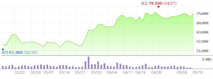 이에 따라 한솔케미칼에 대한 목표주가를 종전 8만원에서 9만원으로 상향 조정했다.최근 3개월간 한솔케미칼 주가 추이 <그래픽출처=네이버>